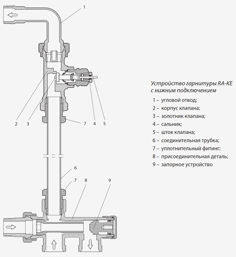 Гарнитура RA-KE состоит из отвода, регулирующего клапана, соединительной трубки и присоединительной детали (013G3366). Регулирующий клапан гарнитуры снабжен устройством для предварительной (монтажной) настройки его пропускной способности.
