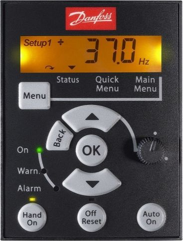 LCP 12 132B0101 съемная панель управления с потенциометром предоставляет доступ ко всем параметрам частотного преобразователя Danfoss через основное меню. Информация на дисплее хорошо видна издалека, активные кнопки подсвечиваются.
